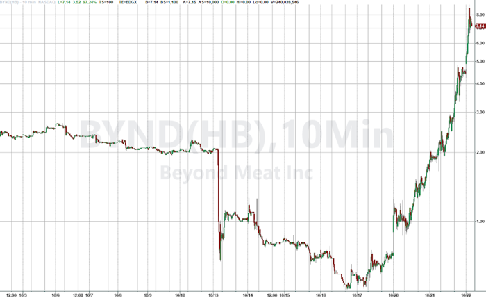 Beyond Meat的股价从上周四收盘时的52美分开始启动。周五,涨势初现端倪,并在本周一加速。据Business Insider报道,一位名为Demitri Semenikhin的交易员在社交媒体上大力宣传该股票,吸引了市场的关注。